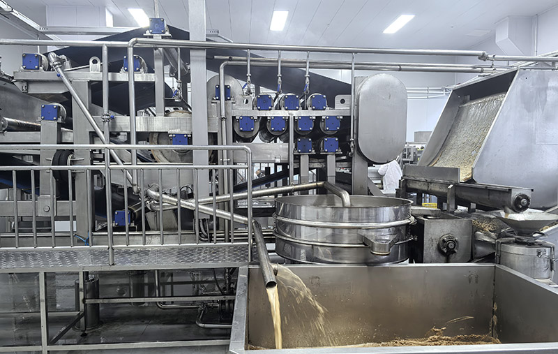 4、压榨和粗滤。常用压榨法和离心分离法榨汁。用孔径0.5毫米的筛网进行粗滤,使不溶性固形物含量下降到20%以下。